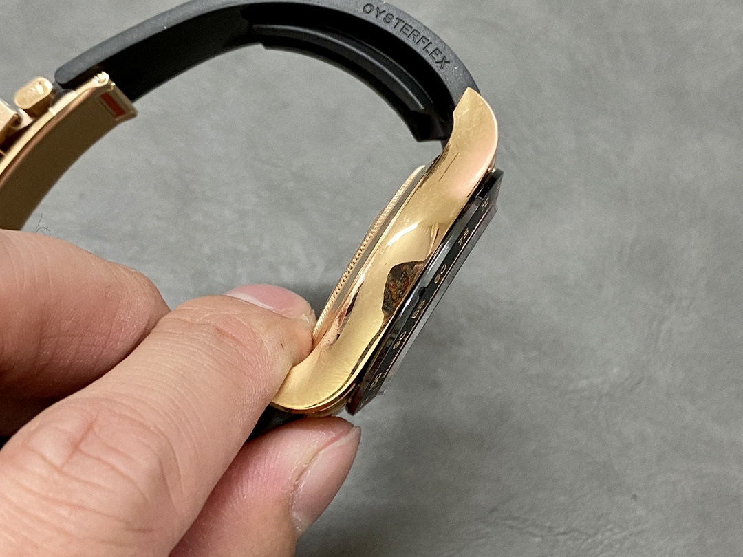 40mm 18K yellow gold case, screw-down yellow gold back, screw-down crown and push buttons with Triplock triple waterproofness, black monobloc Cerachrom bezel with engraved tachymetric scale, scratch-resistant double anti-reflective sapphire crystal,Black Diamond dial with black subdials, index hour markers, Rolex calibre 4130 perpetual self-winding movement with chronograph central second hand, 30-minute counter at 3 o'clock, and 12-hour counter at 9 o'clock, approximately 72 hours of power reserve, black Oysterflex strap made from flexible metal blades overmoulded with high-performance elastomer, Oysterlock folding safety buckle with Easylink 5mm rapid extension system. Waterproof to 100 meters.