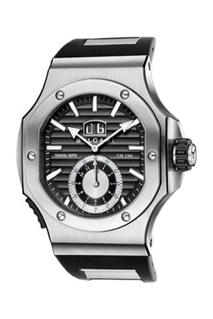 Stainless steel case with a black rubber strap. Fixed bezel. Black dial with silver-tone hands and index hour markers. Dial Type: Analog. Luminescent hands and markers. Date display at the 12 o'clock position. One- 60 seconds- inner 12 hours. Bvlgari Daniel Roth Calibre DR 1306 automatic movement with about 45 hours of power reserve. Scratch resistant sapphire crystal. Skeleton transparent exhibition see through case back. Case size: 56 mm x 51 mm. Unique case shape. Tang clasp. Water resistant at 300 meters / 1000 feet. Functions: chronograph, date, hour, minute, second. Luxury watch style. Watch label: Swiss Made. Item Variations: BRE56BSVDCHS. Bvlgari Endurer Chronograph Automatic Mens Watch 101878