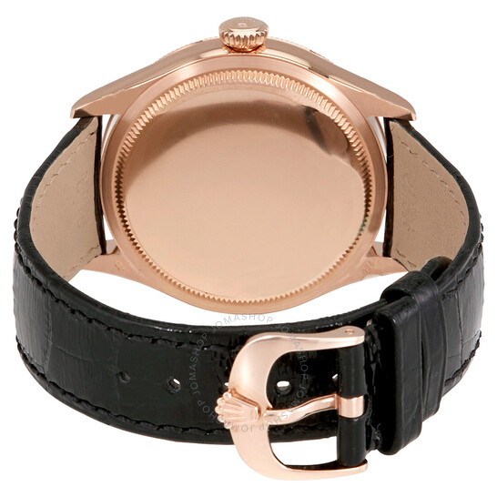 Rose gold-tone 18kt everose gold case with a black crocodile leather strap. Fixed domed and fluted rose gold-tone 18kt everose gold bezel. Black dial with 18kt everose gold alpha-style shape hands and Roman numeral and index hour markers. Minute markers. Dial Type: Analog. Rolex Calibre 3132 Automatic movement, based upon Rolex 3130, containing 31 Jewels, bitting at 28800 vph, and has a power reserve of approximately 48 hours. Scratch resistant sapphire crystal. Screw down crown. Solid case back. Round case shape. Case size: 39 mm. Tang clasp. Water resistant at 50 meters / 165 feet. Functions: hour, minute, second, chronometer. Luxury watch style. Watch label: Swiss Made. Item Variations: 50505-STRAP. Rolex Cellini Black Dial 18 Carat Everose Gold Automatic Men’s Watch 50505BKSL.