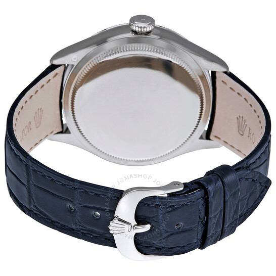 18kt white gold case with a blue leather strap. Fixed domed and fluted 18kt white gold bezel. Blue guilloche dial with silver-tone hands and index hour markers. Minute markers. Arabic numeral minute markers (at 5 minute intervals). Dial Type: Analog. Date display at the 3 o’clock position. Date sub-dial at the 3 o’clock position. Rolex calibre 3165 automatic movement, based upon Rolex 3130, containing 31 Jewels, bitting at 28800 vph, and has a power reserve of approximately 48 hours. Scratch resistant sapphire crystal. Screw down crown. Solid case back. Round case shape. Case size: 39 mm. Oyster clasp. Water resistant at 50 meters / 165 feet. Functions: date, hour, minute, second. Cellini Series. Luxury watch style. Watch label: Swiss Made. Rolex Cellini Blue Guilloche Dial Automatic Men’s Leather Watch 50519BLSBLL.