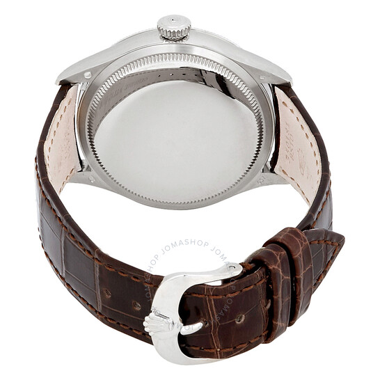18kt white gold case with a brown alligator leather strap. Domed fluted 18kt yellow gold bezel. Black dial with silver-tone alpha-style shape hands and index hour markers. Roman numerals mark the 3, 6, 9 and 12 o’clock position. minute markers. Dial Type: Analog. Rolex Calibre 3132 Automatic movement, based upon Rolex 3130, containing 31 Jewels, bitting at 28800 vph, and has a power reserve of approximately 48 hours. Scratch resistant domed sapphire crystal crystal. Screw down crown. Solid case back. Round case shape. Case size: 39 mm. Tang clasp. Water resistant at 50 meters / 165 feet. Functions: hour, minute, second, chronometer. Luxury watch style. Watch label: Swiss Made. Rolex Cellini Automatic Black Dial Brown Leather Men’s Watch 50509BRSL.