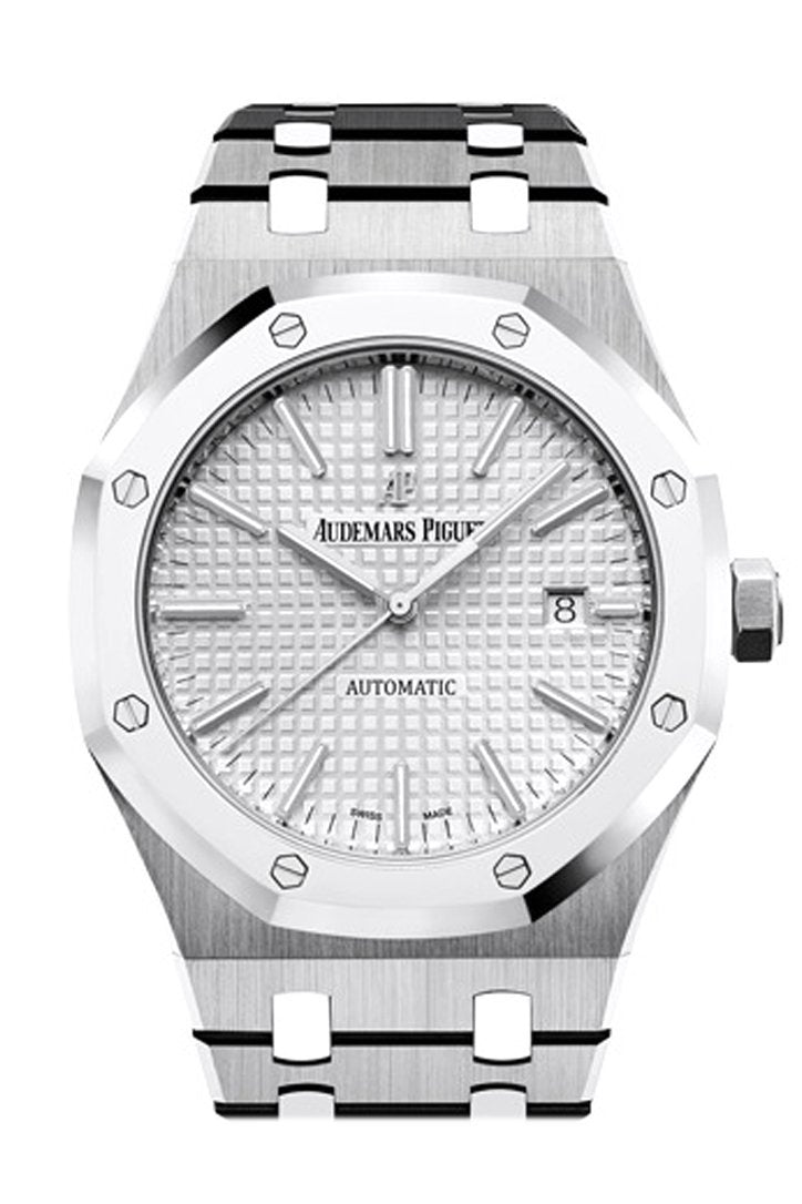 Titanium case with a silver-tone titanium bracelet. Fixed 950 platinum bezel. Rhodium-toned dial with grande tapisserie pattern dial with silver-tone hands and index hour markers. Minute markers around the outer rim. Dial Type: Analog. Luminescent hands and markers. Date display at the 3 o'clock position. Audemars Piguet Calibre 3120 automatic movement with a 60-hour power reserve. Scratch resistant sapphire crystal. Round case shape, case size: 41 mm, case thickness: 9.8 mm. Ap folding clasp. Water resistant at 50 meters / 165 feet. Functions: date, hour, minute, second. Additional Info: qe ii cup 2017 limited edition. Luxury watch style.