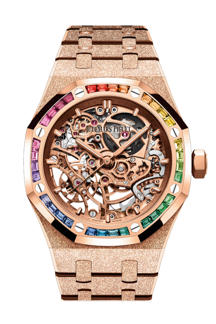 Super Clone Audemars Piguet Royal Oak Frosted Gold Double Balance Wheel Openworked Rose Gold 37mm Rainbow Sapphire Watch 15468OR.YG.1259OR.01-B