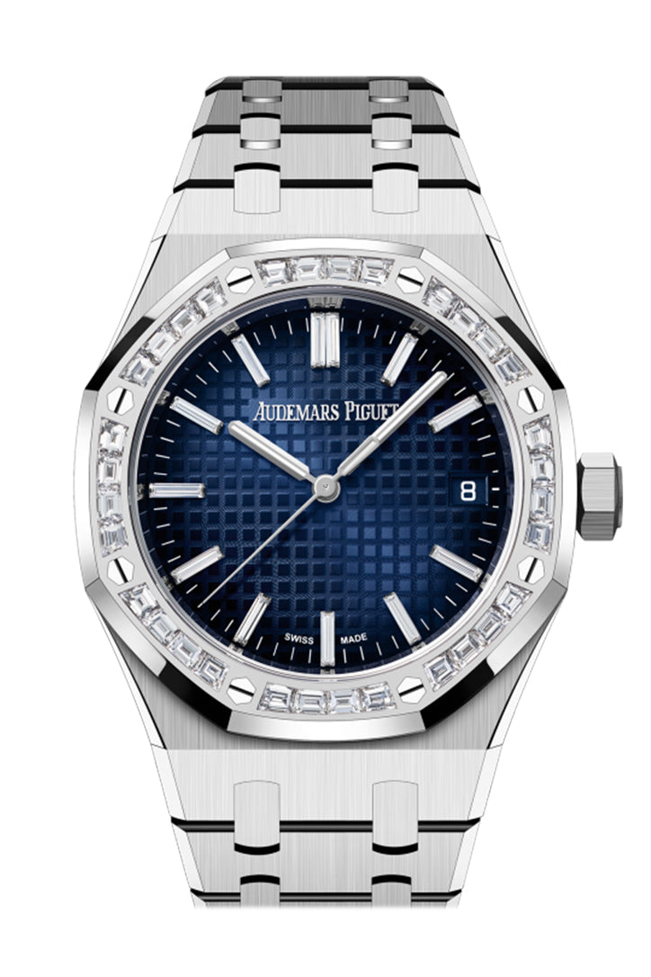 Super Clone Audemars Piguet Royal Oak 34 Blue Diamond Baguette Dial White Gold Diamond Set Bezel Watch 77451BC.ZZ.1261BC.01