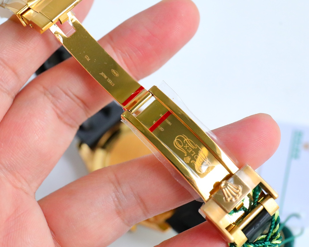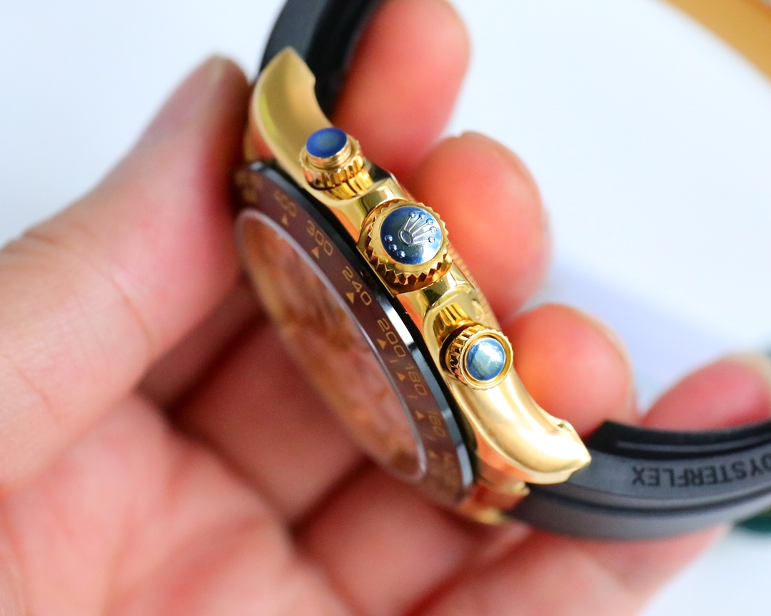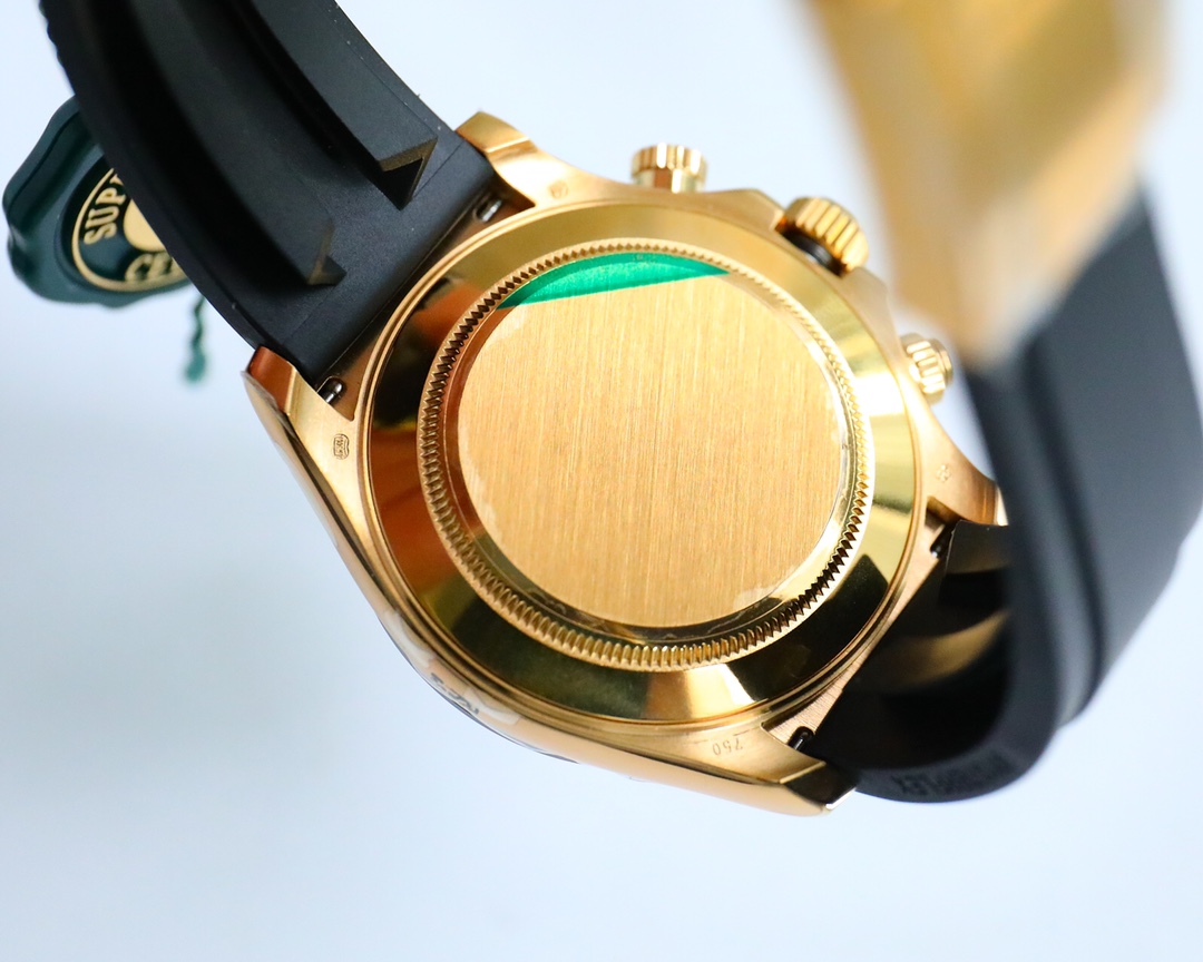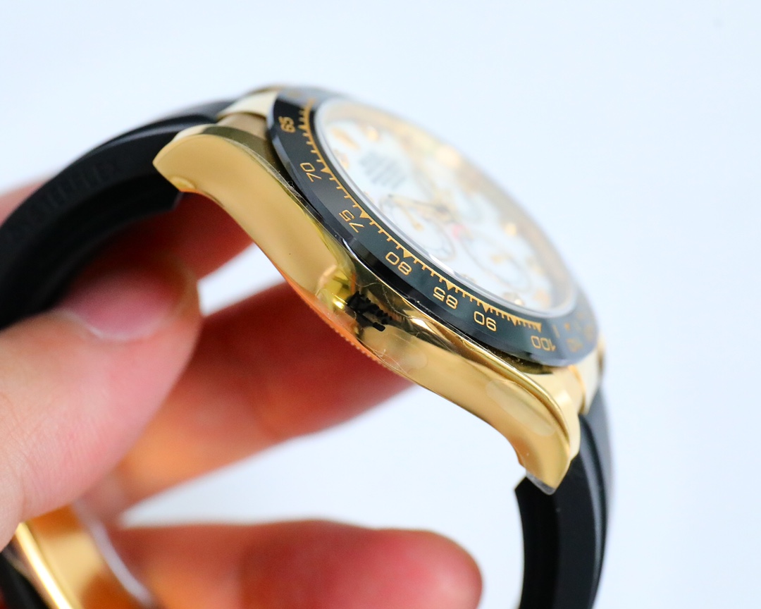 40mm 18K yellow gold case, screw-down yellow gold back, screw-down crown and push buttons with Triplock triple waterproofness, black monobloc Cerachrom bezel with engraved tachymetric scale, scratch-resistant double anti-reflective sapphire crystal, White Mother of Pearl Diamond dial with index hour markers, Rolex calibre 4130 perpetual self-winding movement with chronograph central second hand, 30-minute counter at 3 o'clock, and 12-hour counter at 9 o'clock, approximately 72 hours of power reserve, black Oysterflex strap made from flexible metal blades overmoulded with high-performance elastomer, Oysterlock folding safety buckle with Easylink 5mm rapid extension system. Waterproof to 100 meters.